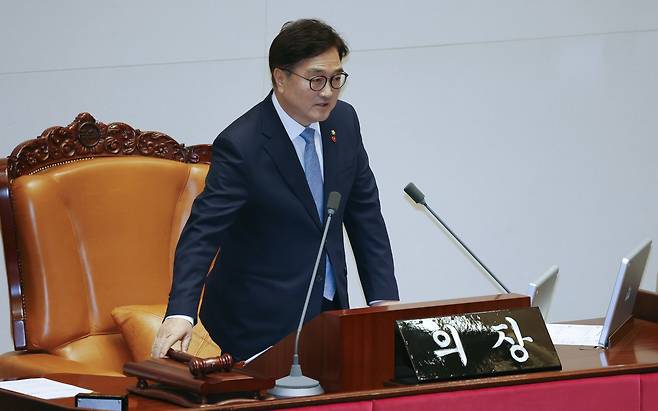 | ▲ 우원식 국회의장이 14일 오후 서울 여의도 국회에서 열린 정치·외교·통일·안보에 관한 대정부질문에서 대통령 권한대행을 맡고 있는 한덕수 국무총리의 불참에 대해 "헌법을 무시하는 것인지, 국회를 무시하는 것인지, 국민을 무시하는 것인지 묻지 않을 수 없다"고 비판했다. |