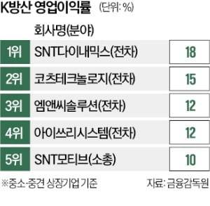14일 금융감독원에 따르면 지난해 국내 증시에 상장된 방위산업체 중 대기업을 제외한 중소·중견기업 가운데 SNT다이내믹스의 영업이익률이 18%로 가장 높았다. SNT다이내믹스는 K-2용 자동변속기와 120㎜ 자주박격포 등을 생산한다. 다음으로 이익률이 높은 코츠테크놀로지(15%)와 엠앤씨솔루션(12%)도 K-2에 통합형 차량 제어 장치와 포탑 구동 장치 등을 각각 납품한다. 아이쓰리시스템(12%)은 K-2와 K-9에 적외선 영상 센서를 넣고 있다.