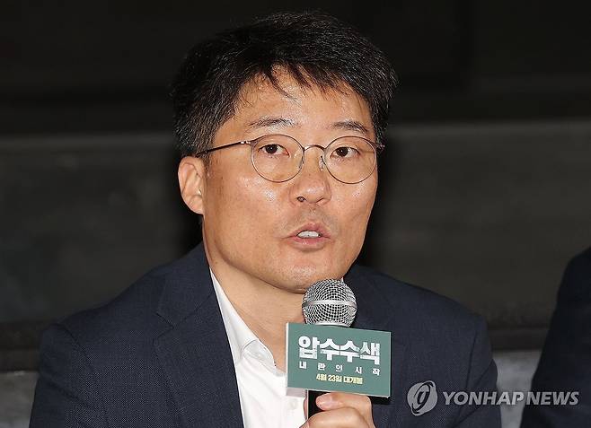(서울=연합뉴스) 이재희 기자 = 14일 서울 성동구 CGV 왕십리점에서 열린 다큐 영화 '압수수색: 내란의 시작' 시사 간담회에서 한상진 뉴스타파 기자가 인사말을 하고 있다. 2025.4.14
