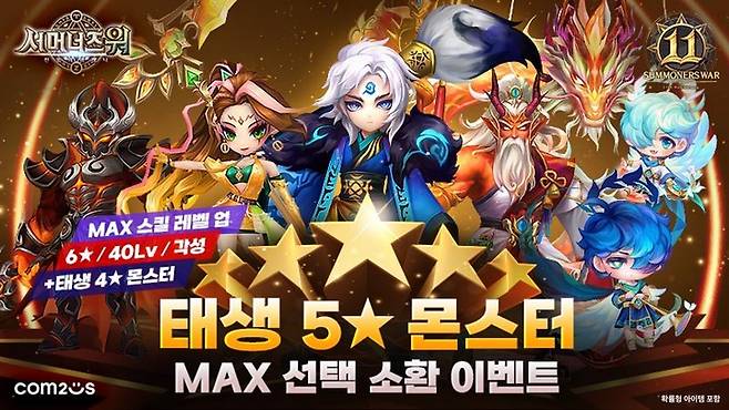 컴투스는 오는 6월 8일까지 '서머너즈 워'의 11주년을 기념하여, 미션을 수행하고 '11주년 기념 코인'을 모은 후 다양한 선물을 받을 수 있는 이벤트를 마련했다. 이번 이벤트에서는 원하는 태생 4·5성 몬스터를 최고 수준으로 성장시켜 소환할 수 있다.