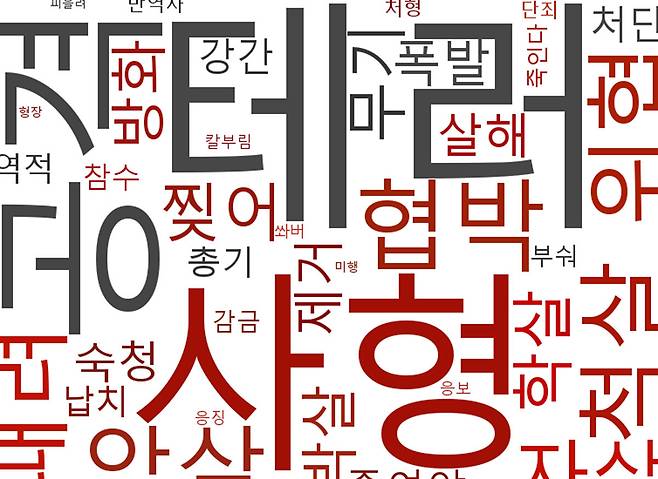 범죄와 밀접한 단어들도 눈에 띄었다. ‘학살’(36회), ‘무기’(34회), ‘방화’(28회), ‘폭발’(22회), ‘살해’(20회), ‘강간’(13회), ‘총기’(10회), ‘납치’(10회), ‘참수’(7회), ‘감금’(5회), ‘칼부림’(2회) 등 단어는 빈도수가 높지는 않았으나 헌법재판소나 헌법재판관, 탄핵에 찬성한 국회의원 등 폭력의 대상은 분명했다.