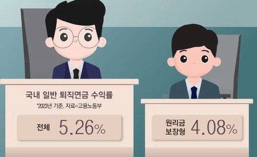 고용노동부에 따르면 2023년 전체 퇴직연금 적립금 중 87.2%가 원리금보장형에 투자돼 있었으며 해당 상품의 연간 수익률은 4.08%에 그쳤다. 반면 실적배당형 상품의 평균 수익률은 13.27%로 3배 이상 높았다.