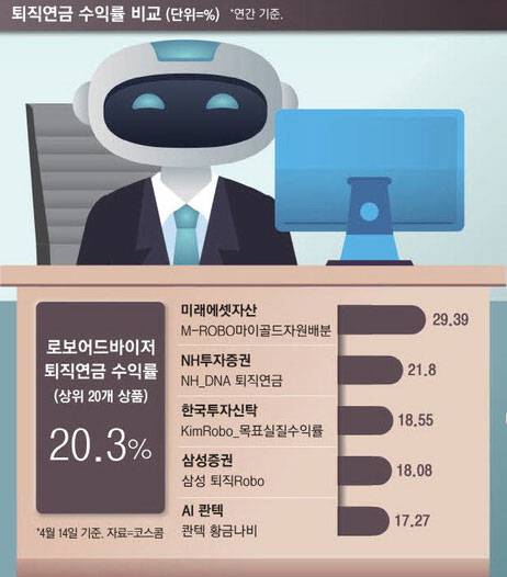 14일 코스콤 RA 테스트베드에 따르면 미래에셋자산운용의 ‘M-ROBO마이골드자원배분_ETF_P’ 퇴직연금 알고리즘은 연환산 수익률이 29.39%로 전체 1위를 차지했다.
