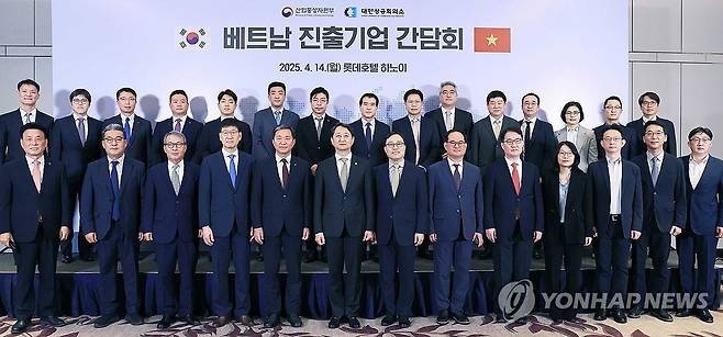 (서울=연합뉴스) 안덕근 산업통상자원부 장관이 14일 베트남 하노이 롯데호텔에서 현대자동차, 삼성전자, 두산에너빌리티, 희성전자를 비롯한 베트남 현지 진출기업 법인장 등 관계자가 참석한 가운데 열린 '베트남 현지 진출기업 간담회'에서 기념촬영을 하고 있다. 2025.4.14 [산업통상자원부 제공. 재판매 및 DB금지]