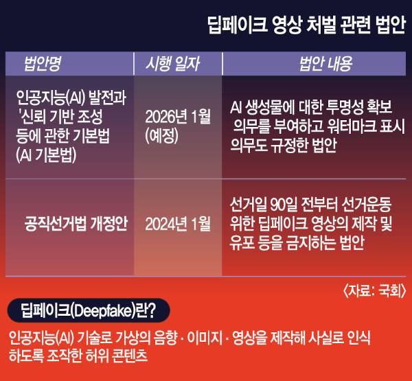 앞서 정치권에서는 딥페이크 영상으로 인한 부작용을 심각하게 받아들이고 국회에서 ‘AI 발전과 신뢰 기반 조성 등에 관한 기본법’(AI 기본법)을 통과시켰다. 내년 1월 시행을 앞둔 해당 법안은 AI 생성물에 대한 투명성 확보 의무를 부여하고 워터마크 표시 의무를 규정하고 있다. 다만 이번 대선은 AI 기본법이 시행되기 전인 법안 공백기에 해당하기 때문에 워터마크 표시 의무가 없고, 온라인에선 AI 제작물 표시 글자를 지우는 영상 툴까지 공유되고 있다.