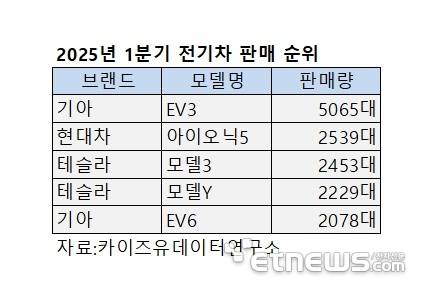 1분기 가장 많이 판매된 전기차는 올해부터 판매가 본격화된 기아 EV3(5065대)였다. 이어 현대차 아이오닉5(2539대), 테슬라 모델3(2453대), 테슬라 모델Y(2229대), 기아 EV6(2078대)가 순으로 나타났다.