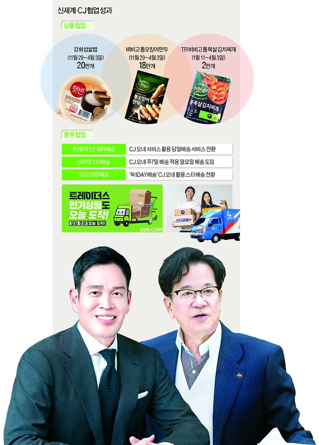 이마트·CJ제일제당 '강화섬쌀밥' 등 판매 호조 냉동국탕류 협업 진행, 전용상품 개발 중 물류 CJ 오네 서비스로 적용으로 '스타배송' 도입 윈윈 멤버십 통합·미디어·콘텐츠 협업 추진하며 쿠팡 추격 고삐
