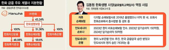 한화 금융계열사들은 최근까지 한화생명 중심으로 지배구조를 정리하고 국외투자 등에 집중하고 있다.
