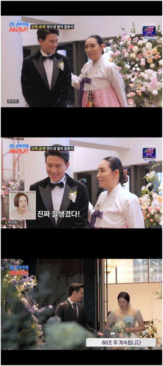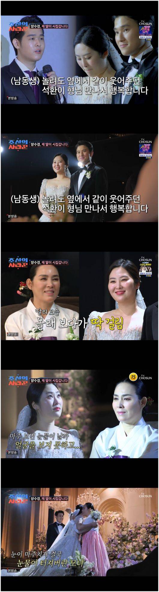 양가 부모에게 인사하는 시간이 됐다. 양수경은 애써 사위만을 바라보았으나, 딸을 안아줄 때 기어이 눈물을 터뜨리고야 말았고, 그것은 딸도 마찬가지였다. 양수경은 “딸이 저랑 좀 더 같이 있을 줄 알았다. 그런데 시집 간다고 하니까 내심 섭섭했다. 나 울기 싫다. 누구보다 예쁘게 보내고 싶고, 시부모님 되실 분들께서 우리 채영이 잘 부탁드린다”라며 특별히 인터뷰를 가질 정도로 딸에 대한 애정을 보였다./osen_jin0310@osen.co.kr