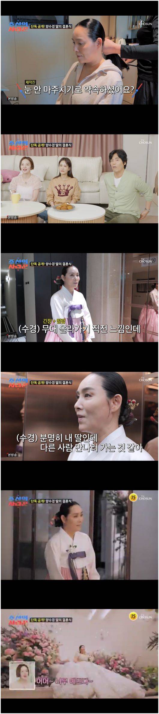 양수경은 "여자들은 결혼할 때, 아기 낳을 때, 엄마가 생각난다고 하는데, 너한테 미안한 게 널 낳지 못해서 미안하다"라며 결혼 전날 눈물을 지으며 딸에게 말했다.