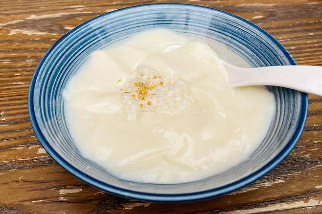 주양두화(酒酿豆花)는 마홍흥에서 필히 시켜야 할 디저트다. 찰랑거릴 정도로 부드러운 두부와 달콤함. 항저우를 대표하는 꽃인 계화잎을 올려 향마저 달달하다.