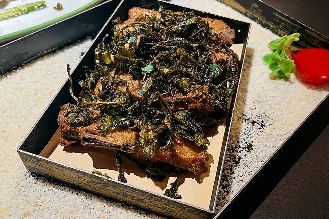 가장 추천하는 요리는 차향갈비. 항저우를 대표하는 용정 찻잎을 물에 불린 뒤 바삭하게 튀겨내, 마찬가지로 튀긴 갈비 위에 수북하게 얹어 내온다. 갈비는 두말할 것이 없고, 인상적인 것은 튀긴 찻잎이다. 바스러지며 쌉싸래하게 풍겨오는 차 향이 기막히다. 꼭 경험해봐야 한다. 가지튀김도 비슷한 결로 튀긴 찻잎이 같이 나온다.