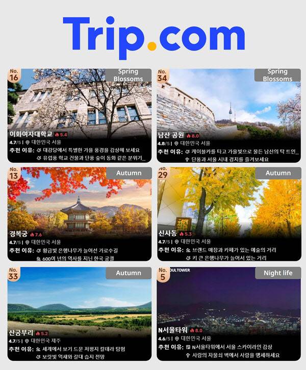 트립닷컴은 계절 테마 랭킹에서 한국이 높은 순위를 기록했다고 밝혔다. 봄꽃 명소에는 이화여대와 남산공원이, 가을 단풍 명소에는 경복궁, 신사동, 남산공원이 포함됐다. 사계절이 뚜렷한 한국 자연환경이 해외 여행자들에게 매력적으로 작용했다는 분석이다.