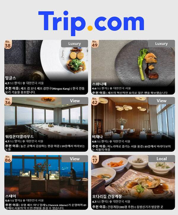 한편 트립닷컴은 ‘트립.베스트’를 AI 분석과 사용자 리뷰, 전문가 평가를 결합한 큐레이션 서비스로 운영 중이다. 해당 랭킹은 웹사이트와 앱에서 다국어로 제공되며, 글로벌 여행자에게 실시간 여행 가이드를 제공한다.