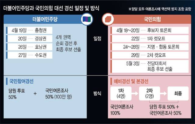 민주당은 오는 27일, 국민의힘은 내달 3일 최종 후보자를 선출한다는 계획이다. 민주당은 주말인 이달 19·20·26·27일 4일간 충청권·경상권·호남권·수도권 등 4개 권역에 걸쳐 순회 경선을 치른다. 권리당원 투표가 끝나면 후보별 최종 득표율과 함께 일반 국민 여론조사 결과를 공개하고 경선 승리자를 발표할 예정이다. 국민의힘은 이달 18~20일 후보자 토론회 등을 거쳐 22일 4명으로 후보를 추리는 1차 경선 결과를 발표한다. 24~28일 지명·합동 토론회와 여론조사를 거쳐 29일 2차 경선 결과를 공개한다. 5월 1~2일 여론조사를 벌인 뒤 3일 최종후보 선출을 위한 전당대회를 연다.