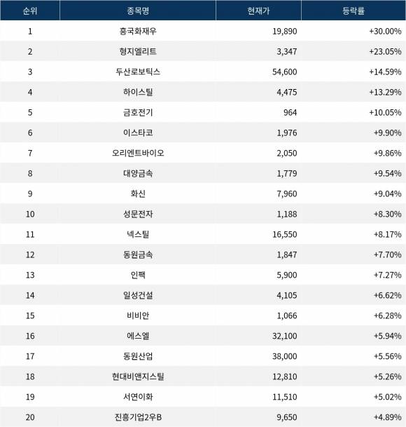 이어 상승률 2위 형지엘리트(093240)는 현재가 3,347원으로 주가가 23.05% 폭등하고 있다. 상승률 3위 두산로보틱스(454910)는 현재 54,600원으로 14.59% 급등하며 좋은 모습을 보인다. 상승률 4위 하이스틸(071090)은 13.29% 급등하며 4,475원에 거래되고 있다. 상승률 5위 금호전기(001210)는 10.05%의 상승세를 타고 964원에 거래되고 있다.