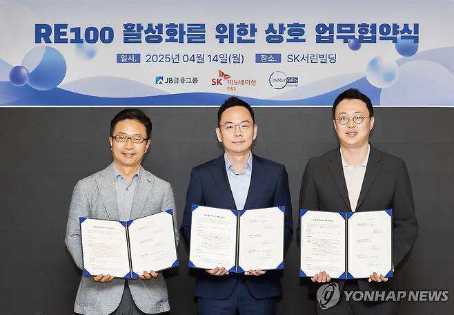 (서울=연합뉴스) 지난 14일 서울 종로구 SK서린빌딩에서 열린 RE100 활성화를 위한 상호 업무협약식에서 최진석 JB금융지주 대외협력본부장(왼쪽부터), 이진모 SK이노베이션 E&S 재생에너지사업기획실장, 천성문 이너젠 CCO이 기념 촬영하고 있다. 2025.4.15 [SK이노베이션 E&S 제공. 재판매 및 DB 금지]