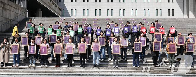 (서울=뉴스1) 허경 기자 = 기후위기비상행동 관계자들이 15일 서울 종로구 세종문화회관 계단에서 기후 단일 의제 대선 TV 토론회 촉구 기자회견을 하고 있다. 2025.4.15/뉴스1