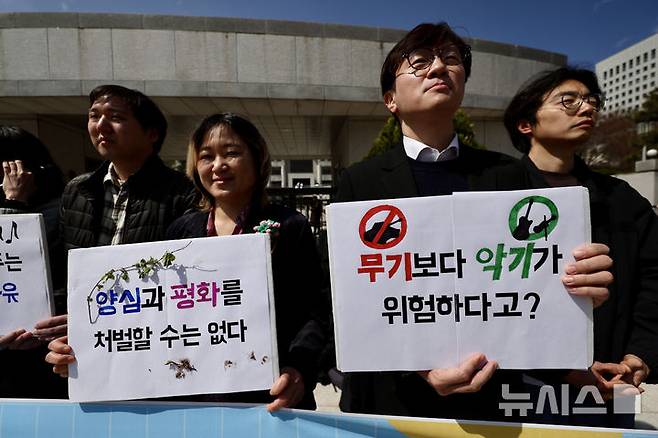 [서울=뉴시스] 김명년 기자 = 전쟁없는세상 회원들이 15일 오전 서울 서초구 대법원 앞에서 무기박람회 DX KOREA 2022 저항행동 대법원 선고에 대한 입장 발표 기자회견을 진행하고 있다. 2025.04.15. kmn@newsis.com