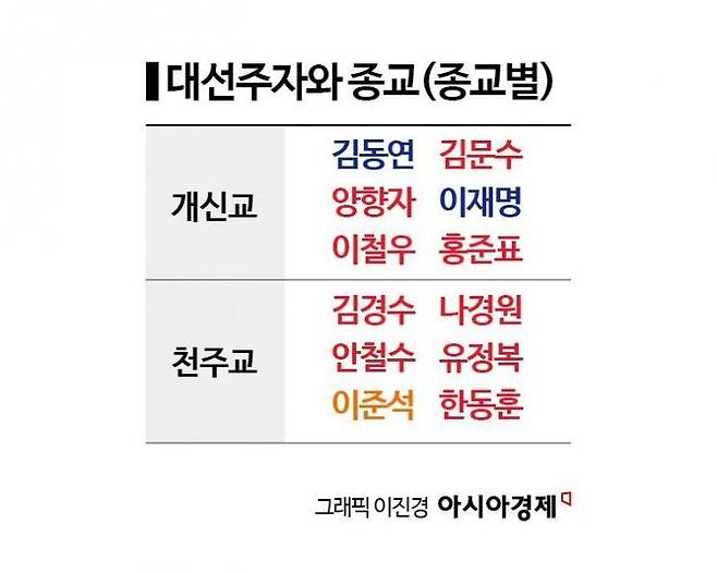 대선주자들의 종교를 분석해보니 국민의힘 대선주자 8명은 개신교와 천주교가 정확히 반으로 갈렸다. 김문수 전 장관, 양향자 전 의원, 이철우 경북도지사, 홍준표 전 대구시장은 개신교, 나경원 안철수 의원과 유정복 인천시장, 한동훈 전 대표는 천주교 신자로 조사됐다. 더불어민주당 주자 3명은 김동연 경기도지사, 이재명 전 대표가 개신교, 김경수 전 경남지사는 천주교로 나뉘었다. 개혁신당 이준석 의원, 정의당 권영국 대표는 천주교였다.