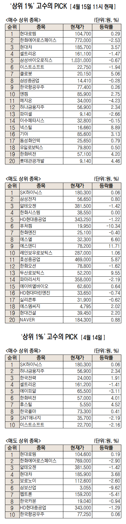 한편 이날 순매도 상위권에는 SK하이닉스, 삼성전자, 알테오젠이 올랐다. 전날 수익률 상위 투자자들이 가장 많이 순매수한 종목은 SK하이닉스, 하나금융지주, 한국전력이었고 순매도 종목은 현대로템, 한화에어로, 알테오젠 순으로 조사됐다.