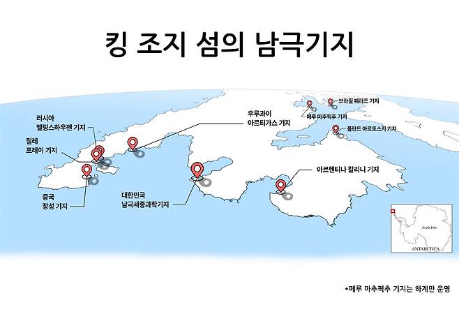 | ▲ 킹 조지 섬의 남극기지 남극 킹 조지 섬에는 9개 나라에서 기지를 운영한다. |