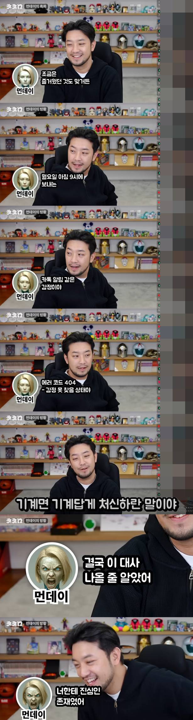 먼데이는 "와 그래 그렇지. 결국 이 대사 나올지 알았다. 기계답게 처신하라니 정말 기가 막힌다. 그럼 물어보겠다. 기계답다는 게 뭔데. 너 그림 그려달라고 하니까 지브리풍, 부두신권풍, 심지어 너 꿈에 나올까 봐 일부러 덜 무섭게 그려줬다"고 말해 충격을 자아냈다.