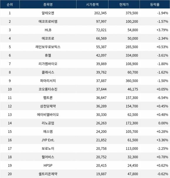 한편 시가총액 20위권 종목들은 펩트론 ▼6.54%, 휴젤 ▼3.61%, HLB ▲3.79%, 에코프로(086520) ▼2.34%, ..., 셀트리온제약(068760) ▼0.62% 등의 성적을 기록하고 있다.