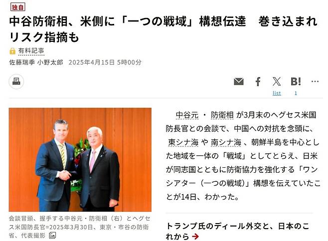 15일자 일본 <아사히신문> 에 따르면, 나카타니 방위상은 지난 3월 30일 도쿄에서 열린 헤그세스 미 국방장관과의 회담에서 중국에의 대항을 염두에 두고 동중국해와 남중국해, 한반도를 '하나의 전역'으로 묶어 방위 협력을 강화하는 구상을 제안한 것으로 알려졌다. 아사히신문>