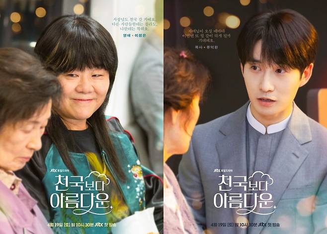 이정은, 류덕환은 오는 19일 첫 방송되는 JTBC 토일드라마 '천국보다 아름다운'에 출연한다. '천국보다 아름다운'은 80세 모습으로 천국에 도착한 이해숙이 30대 모습으로 젊어진 남편 고낙준과 재회하면서 벌어지는 현생 초월 로맨스다. 김혜자, 손석구, 한지민, 이정은, 천호진, 류덕환 등이 출연하며 '힙하게', '눈이 부시게' 등으로 함께 호흡을 맞춰온 김석윤 감독과 이남규·김수진 작가가 재회했다.