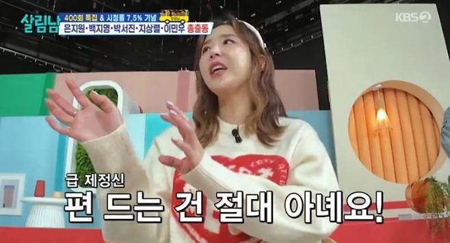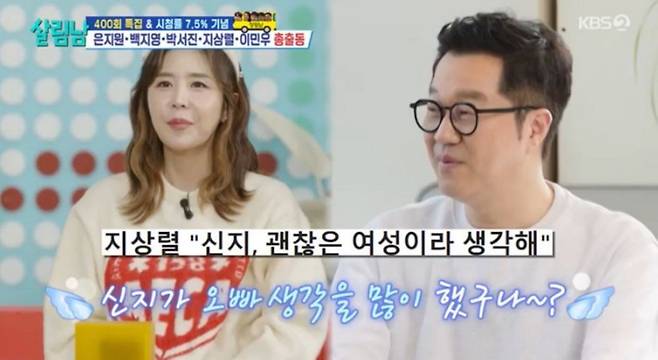 [TV리포트=이지은 기자] 코요태 신지가 지상렬과의 러브라인을 유쾌하게 넘겼다. 최근 방송된 KBS2 '살림하는 남자들'에서는 400회를 맞아 백지영, 은지원, 지상렬, 이민우 등 출연진들이 박서진의 새 집에서 집들이를 하는 모습이 그려졌다.