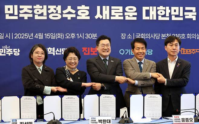 [서울=뉴시스] 조성봉 기자= 박찬대 더불어민주당 대표 직무대행 겸 원내대표를 비롯한 참석자들이 15일 오후 서울 여의도 국회에서 열린 내란종식 민주헌정수호 새로운 대한민국 원탁회의에서 2차선언문에 서명하고 기념촬영을 하고 있다. 왼쪽부터 용혜인 기본소득당 대표, 김선민 조국혁신당 대표 직무대행, 박 당대표 직무대행, 윤종오 진보당 상임대표 직무대행 겸 원내대표, 한창민 사회민주당 대표. (사진=진보당 제공) 2025.04.15. photo@newsis.com *재판매 및 DB 금지