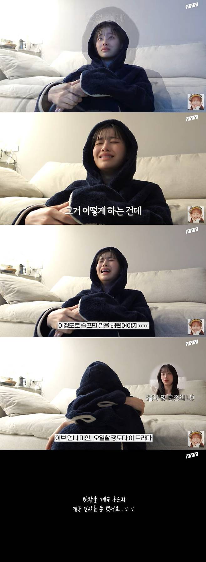 츄는 "이브 언니는 보고 엄청 울었다고 하다던데 그렇게 울 정도인가?"라며 아직 눈물 날 정도로 슬프진 않았음을 밝혔다.