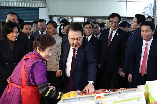 | ▲ 2024년 12월 2일, 윤석열 당시 대통령이 충남 공주산성시장에서 과일을 보고 있다. |