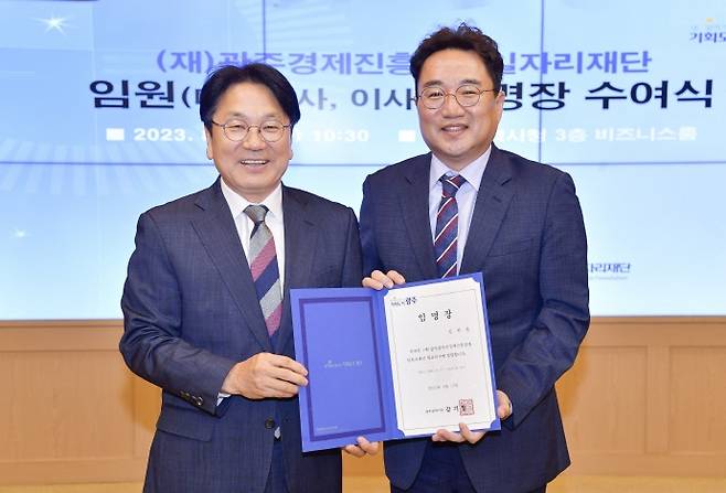 | ▲ 2023년 8월 22일, 강기정 광주광역시장이 김현성 (재)광주경제진흥상생일자리재단 대표이사(사진 오른쪽)에게 임명장을 수여하고 있다. |