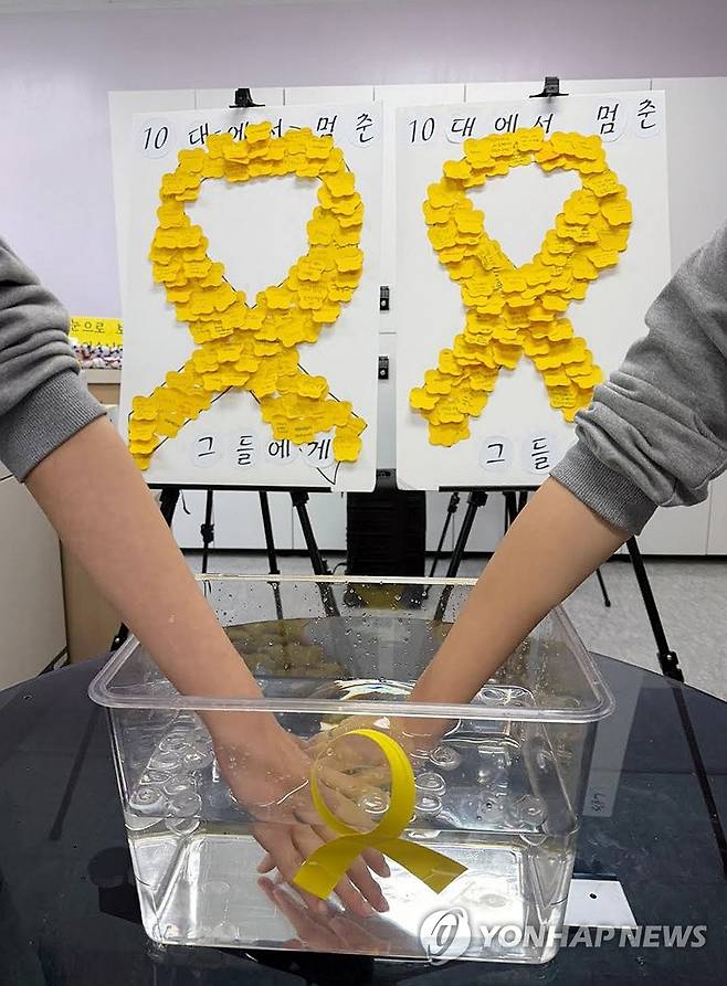 (강릉=연합뉴스) 15일 강원 강릉시 율곡중학교에서 학생자치회가 주관한 세월호 참사 11주기 기억행사에서 학생들이 바닷물 온도(약 11도)에 수온을 맞춘 수조에 손을 담그며 묵념하는 퍼포먼스에 참여하고 있다. 2025.4.15 [전국교직원노동조합 강원지부 제공. 재판매 및 DB 금지]