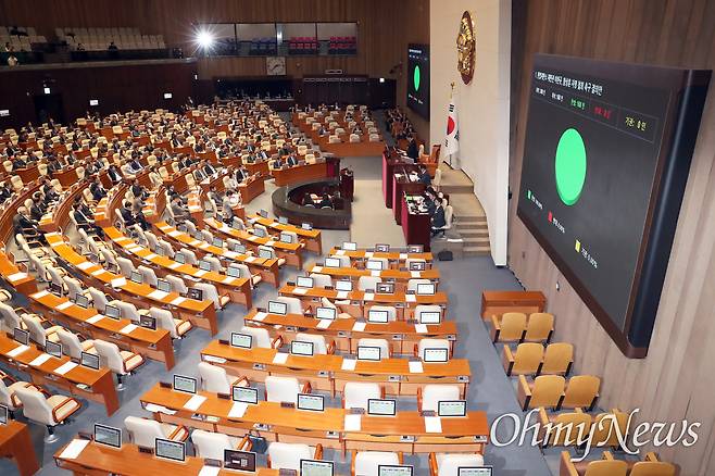 | ▲ 헌법재판관 이완규, 함상훈 지명 철회 촉구 결의안 통과 헌법재판소 재판관 이완규, 함상훈 지명 철회 촉구 결의안이 15일 국회 본회의에서 국민의힘 의원들이 퇴장한 가운데 통과되고 있다. |