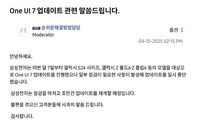 삼성전자는 15일 오후 삼성멤버스 커뮤니티에 자사 통합형 인공지능(AI) 플랫폼 'One UI 7' 업데이트를 일시 중단한다고 공지했습니다.