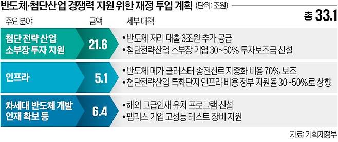 정부가 국내 반도체산업 지원을 위한 재정 투입 규모를 26조원에서 33조원으로 늘리기로 하면서 삼성전자 SK하이닉스 등 대기업뿐 아니라 소부장(소재·부품·장비) 기업의 투자 부담이 한층 줄어들 전망이다.