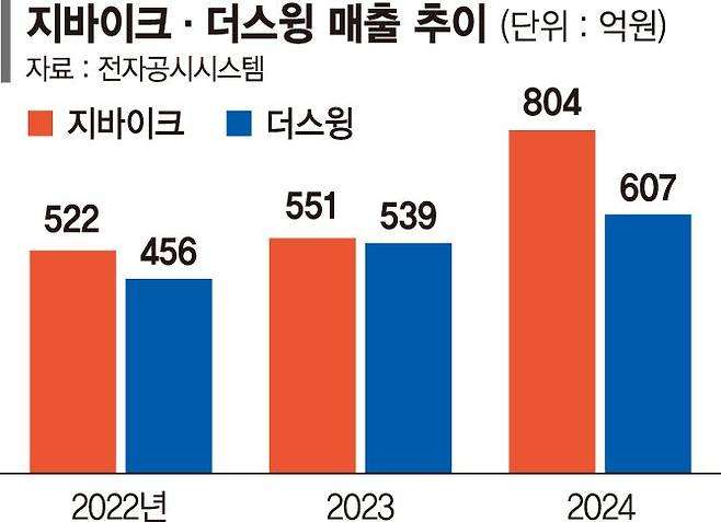 양사는 2023년까지만 해도 박빙의 성적을 기록했다. 당시 지바이크와 더스윙의 매출은 각각 551억원, 539억원으로 12억원 차이에 불과했다.