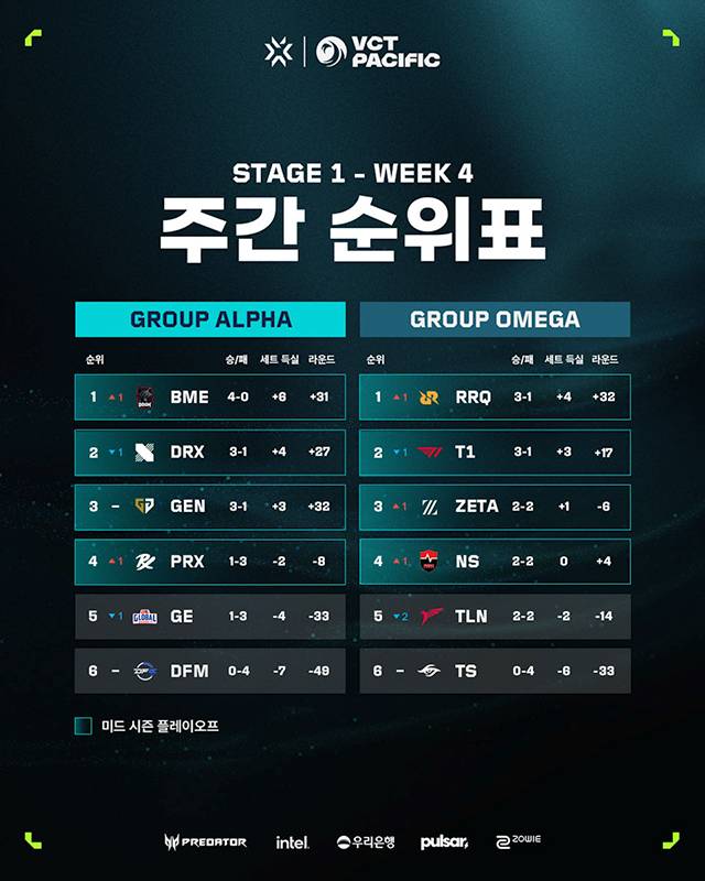 5대5 대전형 캐릭터 기반 전술 슈팅 게임 '발로란트'의 개발 및 유통사인 라이엇 게임즈(한국 대표 조혁진, www.playvalorant.com/ko-kr)는 지난 12일(토)부터 14일(월)까지 서울 마포구 상암동에 위치한 상암 SOOP 콜로세움에서 열린 VCT 퍼시픽 스테이지 1 4주 차에서 알파 그룹에 속한 DRX와 오메가 그룹의 T1이 첫 패배를 당하면서 연승 행진에 제동이 걸렸다고 밝혔다. 각 그룹에서 1위 자리를 놓고 경쟁하던 팀들에게 패하면서 DRX는 알파 그룹 1위 확률이 사라졌고 T1은 자력으로 1위에 오를 가능성이 크게 줄어들었다.