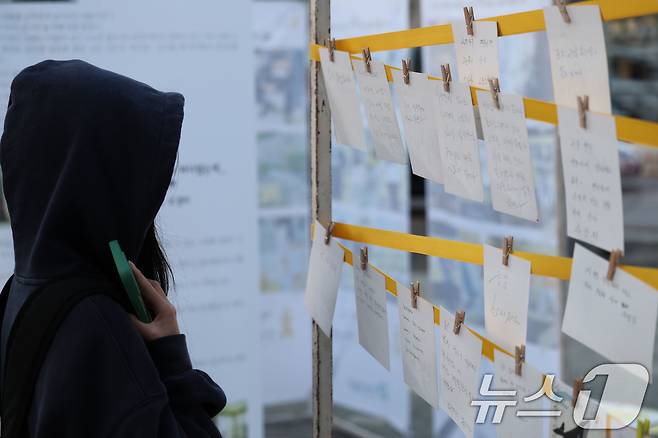(광주=뉴스1) 박지현 기자 = 4·16 세월호 참사 11주기를 하루 앞둔 15일 광주 남구 백운광장 일대 열린 기억문화제에서 한 학생이 추모글을 읽고 있다. 2025.4.15/뉴스1
