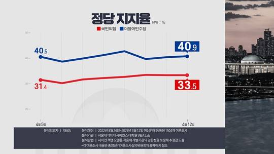 그 결과 지난 12일 기준 국민의힘 지지율은 33.5%, 더불어민주당은 40.9%로 집계됐습니다. 지난 5일과 비교해 국민의힘 지지율은 2.1%p 상승했고 더불어민주당 지지율은 0.4%p 올랐습니다.