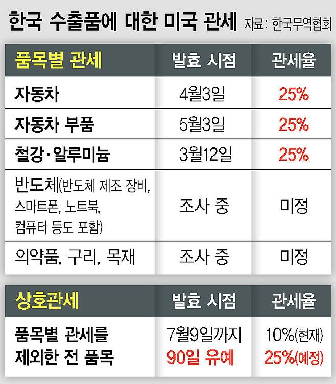 협상 실익이 얼마나 될지도 의문이다. 국책연구원인 대외경제정책연구원이 낸 ‘트럼프 2기 상호관세 조치의 주요 내용과 시사점’ 보고서를 보면, 미국이 대다수 무역 상대에게 일괄적으로 부과했거나 부과 예정인 보편·품목 관세 대상을 뺀 상호관세 대상은 한국의 지난해 수출액 기준으로 1315억달러 중 42%인 556억달러에 머문다. 반면 반도체·자동차·철강·전자제품 등 우리 수출의 주력 제품들은 상호관세 대상이 아닌 ‘보편 품목 관세’ 대상이거나 대상이 될 예정이다. 개별 국가 간 협상으로 세율을 낮출 수 없는 성질의 트럼프 관세에 우리 핵심 수출품이 걸려 있다는 뜻이다. 상호관세 역시 우리나라에 부과한 25% 세율 중 10%는 협상과 무관하게 적용되는 기본 관세라는 점도 협상의 실익을 크게 기대하기 어렵게 한다.