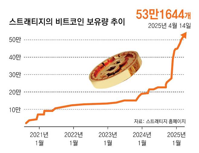 사명도 올해 2월 마이크로스트래티지에서 스트래티지로 바꾸고 회사 로고에 비트코인 이미지를 넣었다. 세일러 의장은 미국 투자은행 번스타인 애널리스트인 가우탐 추가니와의 인터뷰에서 ‘비트코인 리딩 뱅크’라는 목표를 포함해 비트코인 관련 사업의 확장을 회사의 주요 성장 전략으로 삼겠다고 밝혔다. 이 회사가 3월 31일 미 증권거래위원회(SEC)에 제출한 ‘8-K 보고서’(Form 8-K·기업에 중요한 사건이나 변화가 생겼을 때 신속하게 공시하는 문서)에서 밝힌 비트코인 보유 개수는 52만8185개로, 447억 달러 수준이다. 이는 일반 기업 중 세계에서 두 번째로 많은 비트코인을 보유한 비트코인 채굴 기업 ‘마라톤디지털홀딩스’의 10배를 넘는다.