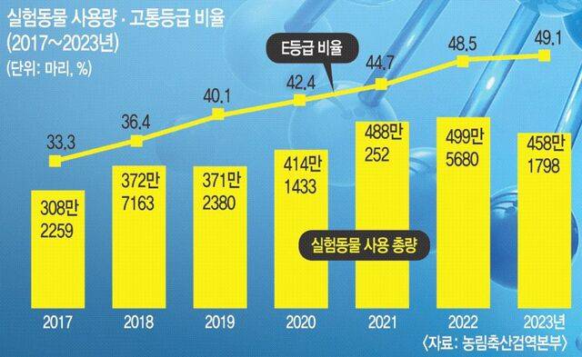 국내 실험동물 사용은 증가 추세다. 농림축산검역본부에 따르면 2022년 실험에 사용된 동물 수는 총 499만5680마리로 3년 사이 30% 이상 증가했다. 2023년에는 458만여 마리로 소폭 감소했지만, 극심한 고통을 수반하는 ‘E등급’ 실험에 동원되는 동물의 비율은 최고치였다. 미국과 유럽이 A~C 등급 중심의 저고통 실험 방식으로 전환 중인 흐름과는 명확히 대조된다.