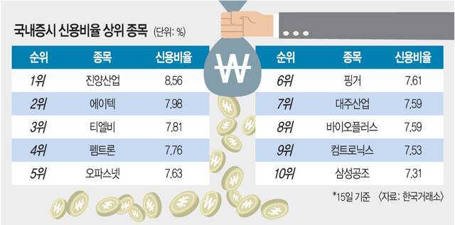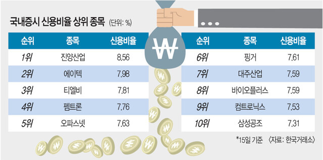 이 밖에도 한동훈 전 국민의힘 대표 테마주로 엮인 오파스넷(7.63%)과 토큰증권(STO) 정책 테마주 핑거(7.61%), 세종시 행정수도 테마주 대주산업(7.59%) 등이 신용비율 상위 종목에 이름을 올렸다. 김대종 세종대 교수는 “정치 테마주는 예상치 못한 상황에서 급락하기 때문에 투자에 각별히 주의해야 한다”고 말했다.