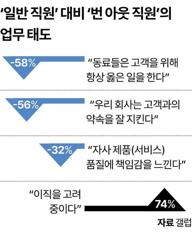 번아웃 직원은 업무 책임감과 적극성도 떨어져 회사 수익에도 영향을 미치는 것으로 나타났다. “번아웃을 경험했다”고 답한 응답자는 그렇지 않은 응답자에 비해 ‘제품(서비스) 품질에 큰 책임감을 느낀다’는 비율이 32%나 적었다. 또 번아웃 직원은 ‘이직을 고려 중’이라는 답변이 무려 74%나 높았고, ‘회사가 고객과의 약속을 잘 지킨다’고 말할 가능성은 56%가 낮았다. 또 브루스 리 교수팀(미 뉴욕시립대 공중보건대학원)의 연구 결과에 따르면, 직원 1,000명 규모의 미국 기업에서 번아웃으로 인한 이직, 비효율적 업무 수행 등으로 연간 약 73억 원의 피해가 발생하는 것으로 추산됐다. 갤럽은 “기업은 수익을 위해서라도 직원 정신 건강과 복지에 집중할 필요가 있다”고 덧붙였다.