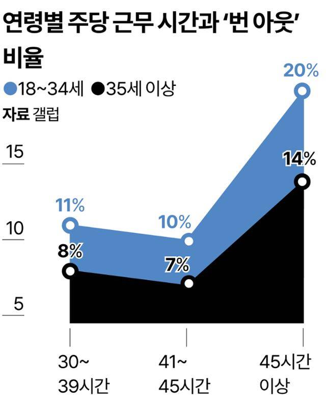 최근 갤럽이 미국 직장인을 상대로 한 조사 결과에 따르면, 주당 근무시간이 30~39시간일 때 번아웃 발생 비율은 8~11%, 41~45시간일 때 7~10% 수준이었지만, 45시간을 넘기면 14~20%로 급격하게 올랐다.