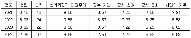[표] EIU '민주주의 지수'에서 한국의 점수와 순위